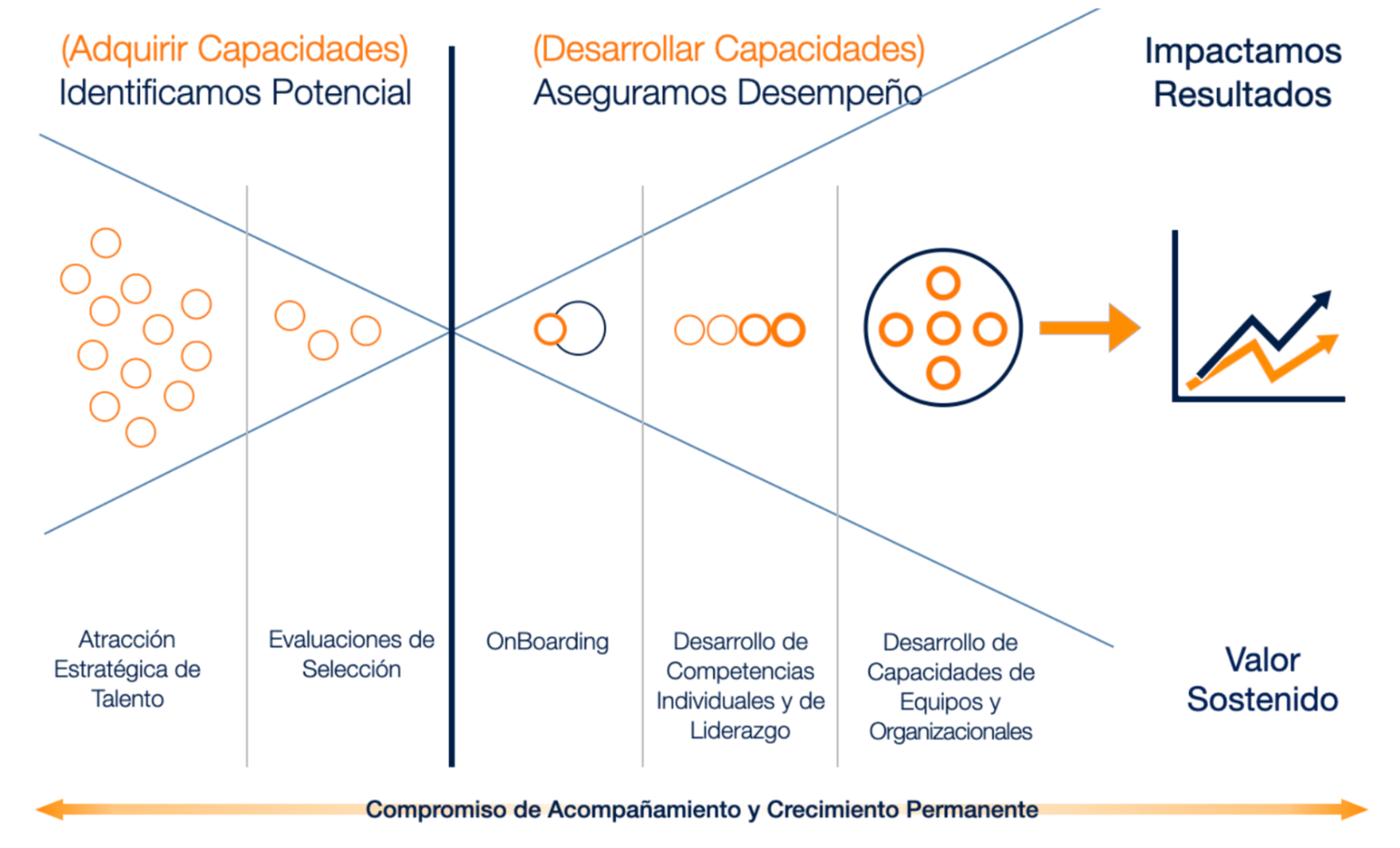 Realizamos un diagnóstico profundo y científico de las capacidades actuales de la organización, sus equipos, líderes y colaboradores y definimos iniciativas clave de mejora para ellos, apoyando su avance en esas iniciativas y ayudándoles a desarrollar sus capacidades y competencias individuales, de equipos y organizacionales, para impactar los indicadores clave de negocio.